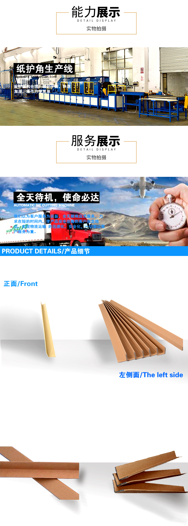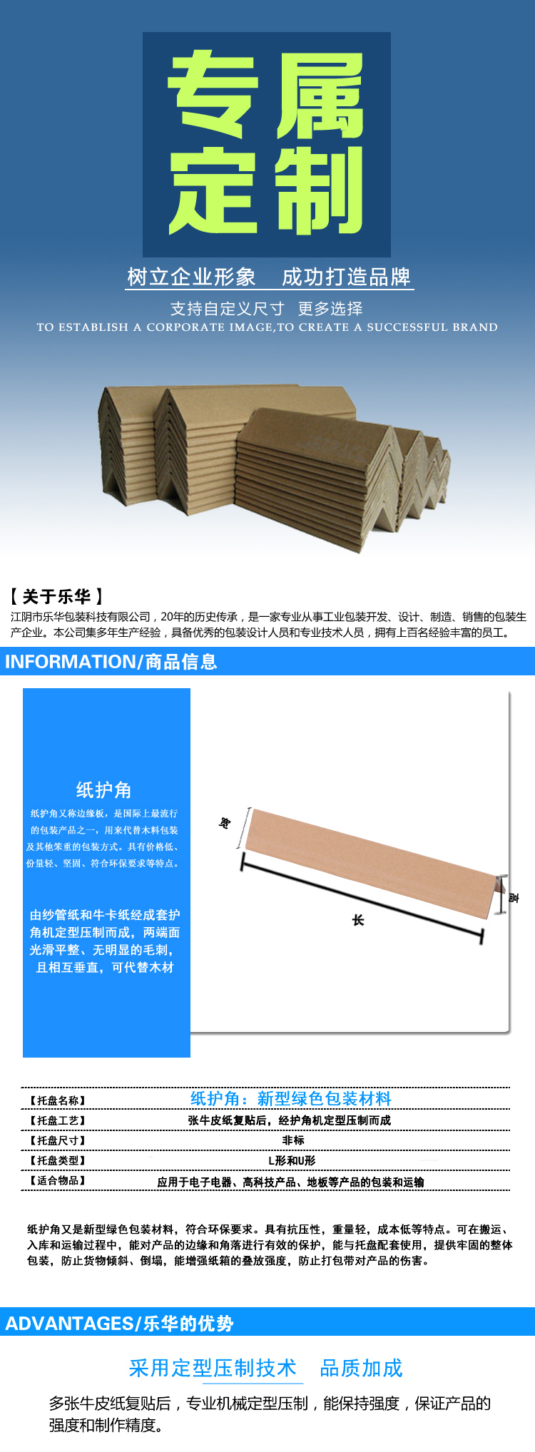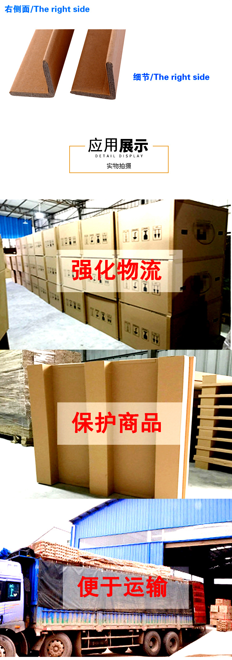 紙護角又稱護角板或紙角鐵,由紗管紙和??堉瞥?,是理想的新型綠色包裝材料,符合環(huán)保要求。具有抗壓性,重量輕,成本低等特點。可在搬運、入庫和運輸過程中,能對產(chǎn)品的邊緣和角落進行有效的保護,能與托盤配套使用,提供牢固的整體包裝,防止貨物傾斜、倒塌,能增強紙箱的疊放強度,防止打包帶對產(chǎn)品的傷害。廣泛應(yīng)用于電子電器、高科技產(chǎn)品、地板等產(chǎn)品的包裝和運輸。