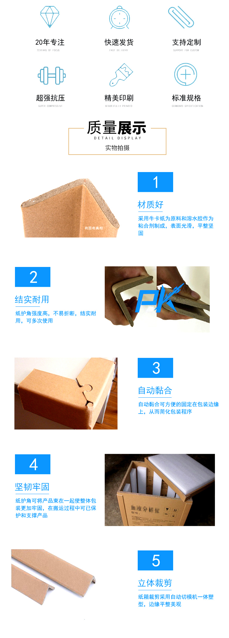 3. 終端保護:保護兩端易損壞的地方,即能固定產(chǎn)品又可以防止打包帶帶來的損害。