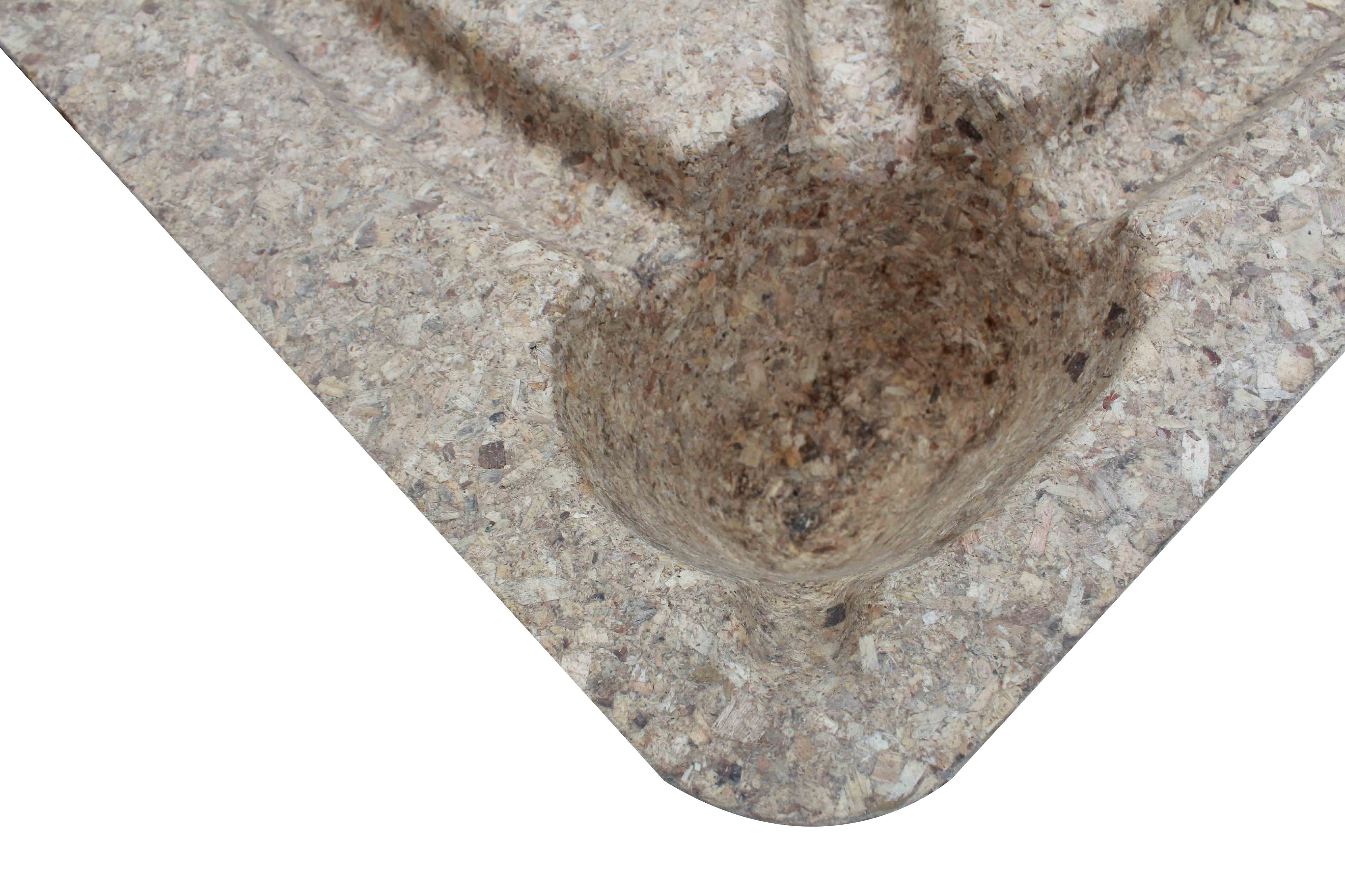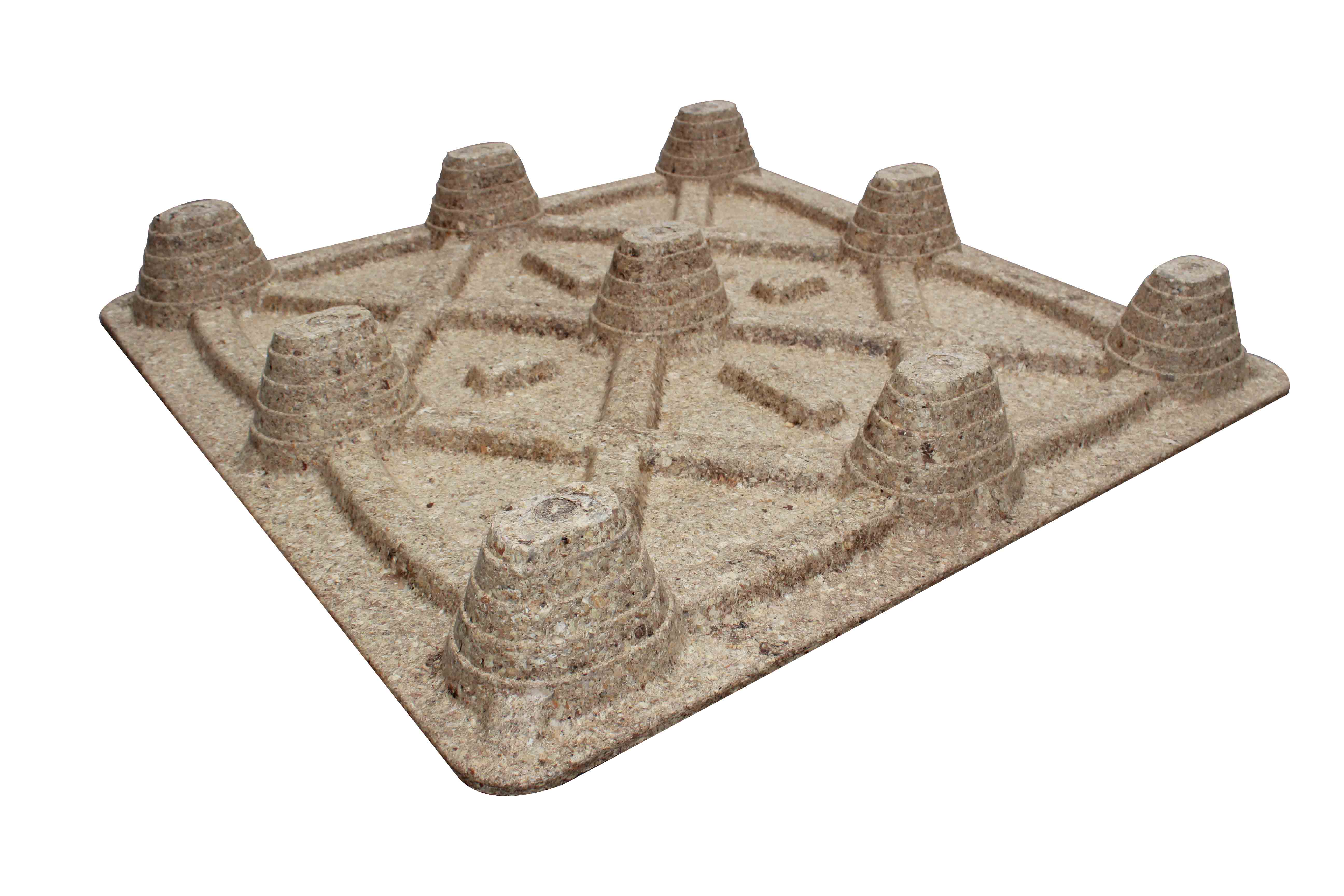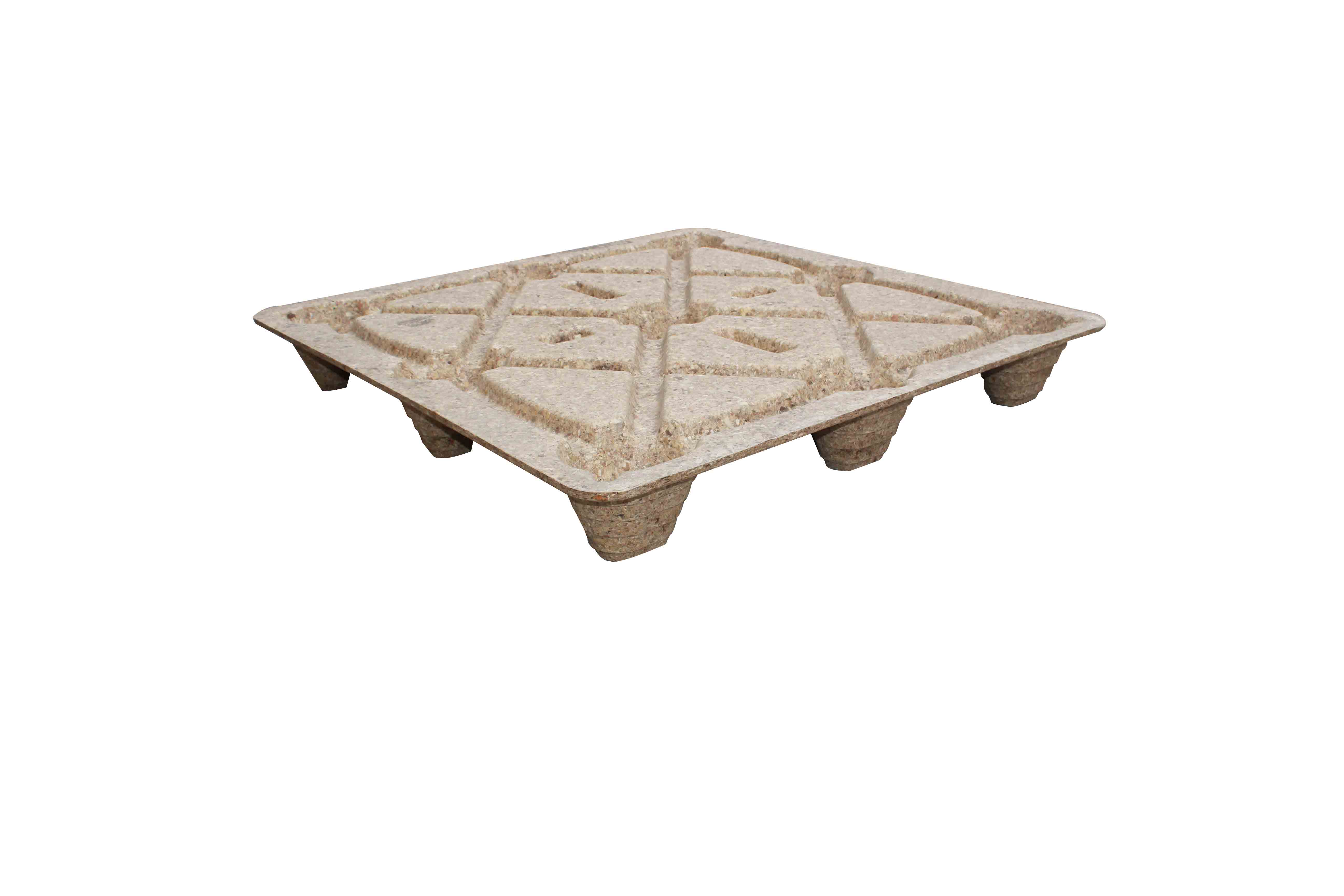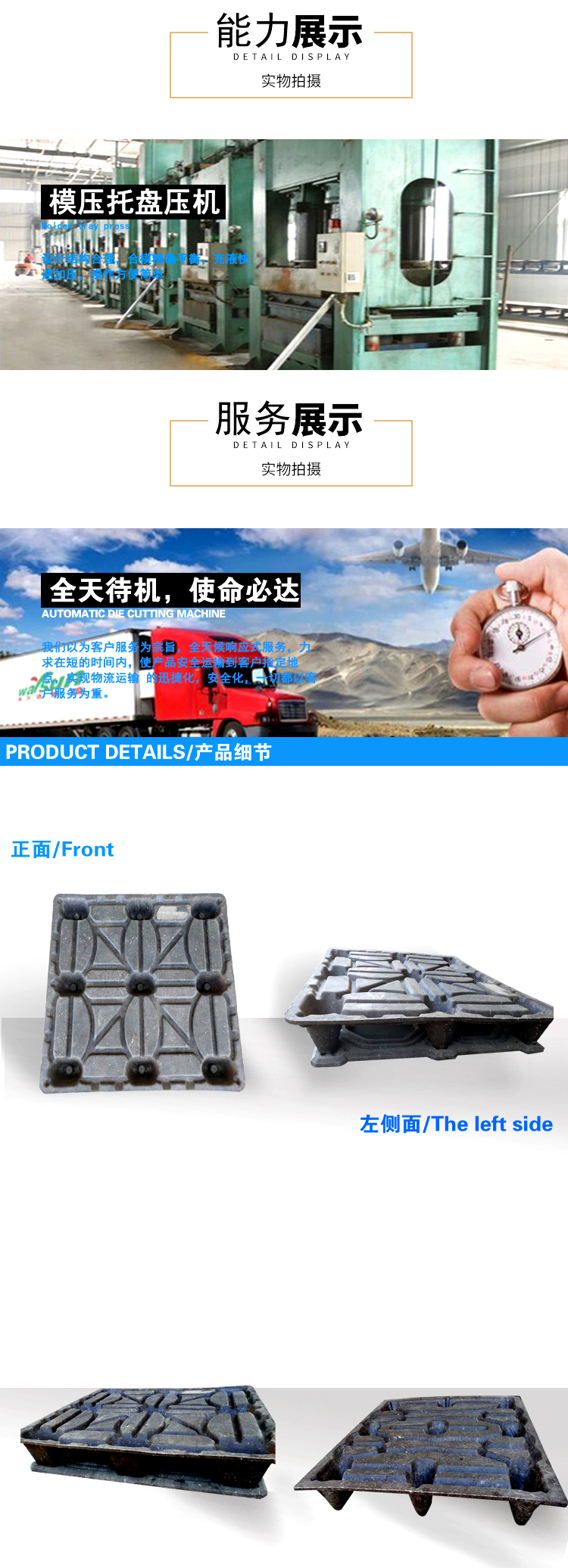 模壓托盤全稱是植物纖維模壓平面工業(yè)托盤。該托盤用的原材料是刨花木屑、植物秸稈等,是整體結(jié)構(gòu),面板和9個支撐腳一次模壓成型。托盤板上表面平整光滑,可滿足各種貨物的運輸,下表面設(shè)有加強筋。板面縱橫受力均衡,九個腳分布能滿足鏟車四向插入,屬平面四向進(jìn)叉單面托盤。